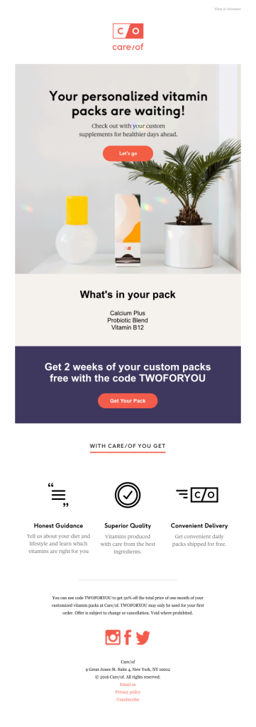 Care/of offers personalized vitamin packs and incorporates their package in their email promotions.